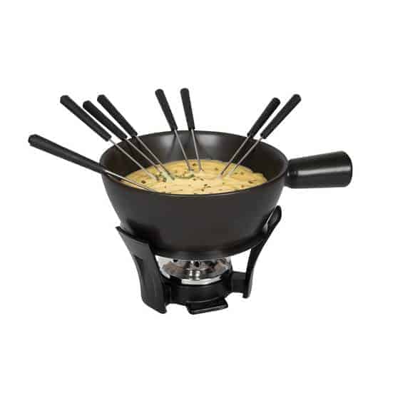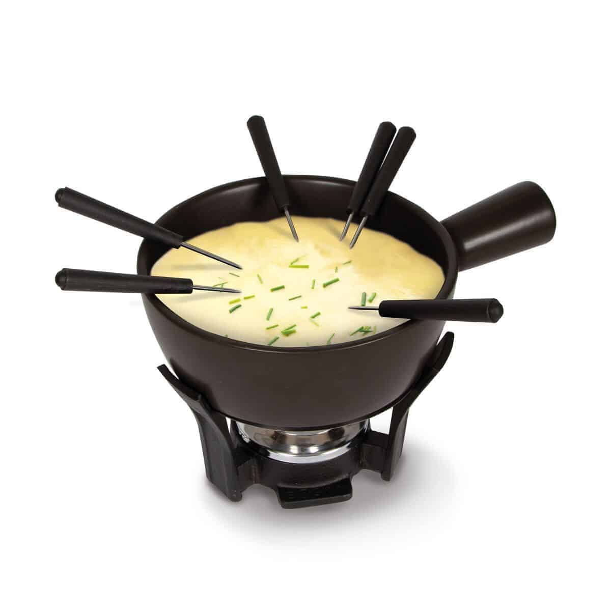 Een avond kaas fonduen? Daar hoort een mooi compleet fondueset bij! Dit prachtige set bevat een stevige vuurvaste, keramieken pan met een inhoud van 2,2 liter, op een stevig gietijzeren onderstel. En uiteraard compleet met 8 stevige vorken.