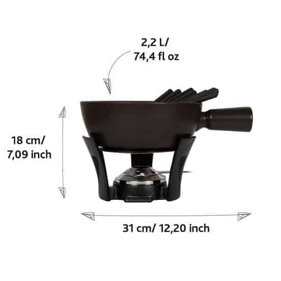 De mooie zwarte keramieken pan is geschikt voor op het gasfornuis, makkelijk om je kaas te laten smelten. Na het opwarmen zet je de pan op het onderstel, brander aansteken en genieten maar. De pan is groot genoeg om ongeveer 1,3kg kaas in te laten smelten.