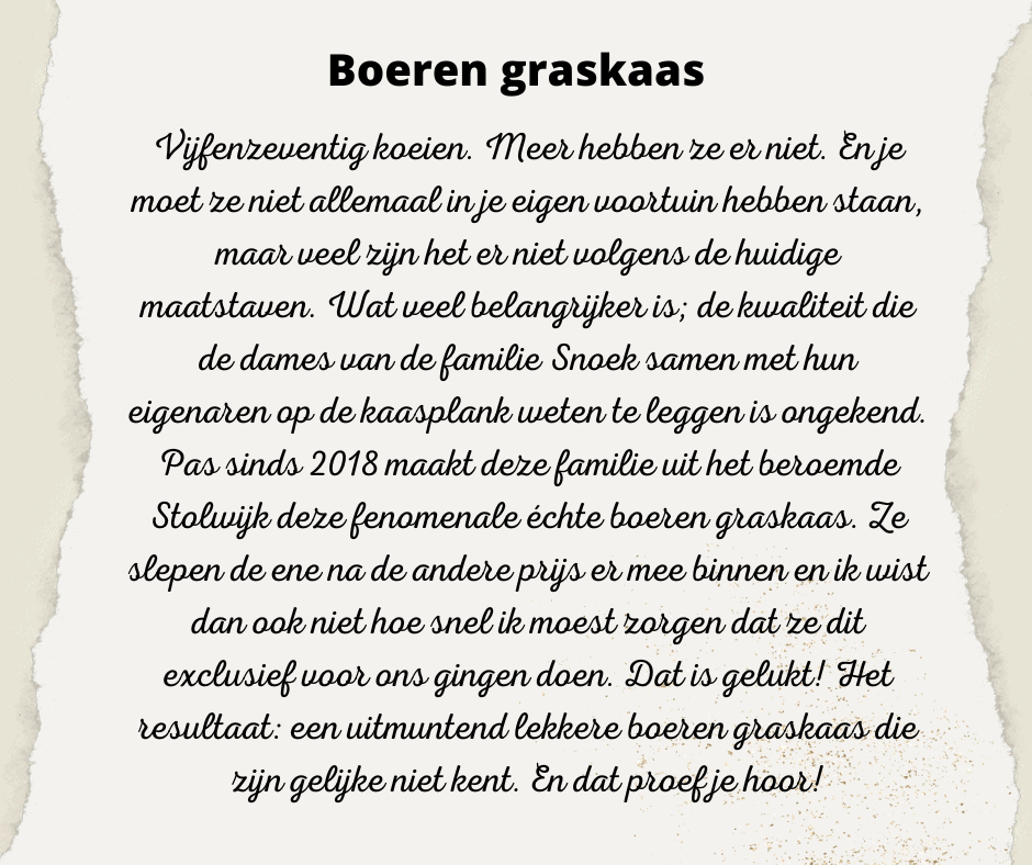 Für den wahren Enthusiasten haben wir wieder etwas Besonderes in petto: Bauerngraskäse, direkt vom Bauernhof Gertjan Snoek aus Stolwijk in Südholland.